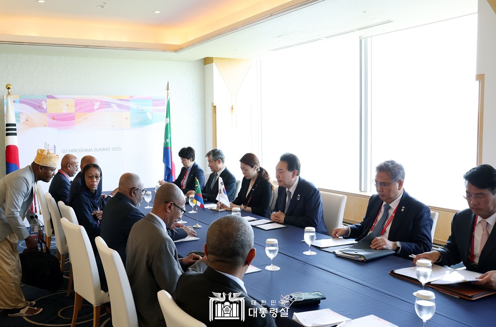윤석열 대통령은 오늘(5. 21, 일) 오전 히로시마 G7 정상회의 참석 계기에 아프리카연합(AU) 의장 자격으로 G7 정상회의에 참석한 아잘리 아쑤마니(Azali Assoumani) 코모로 대통령과 정상회담을 가졌습니다.